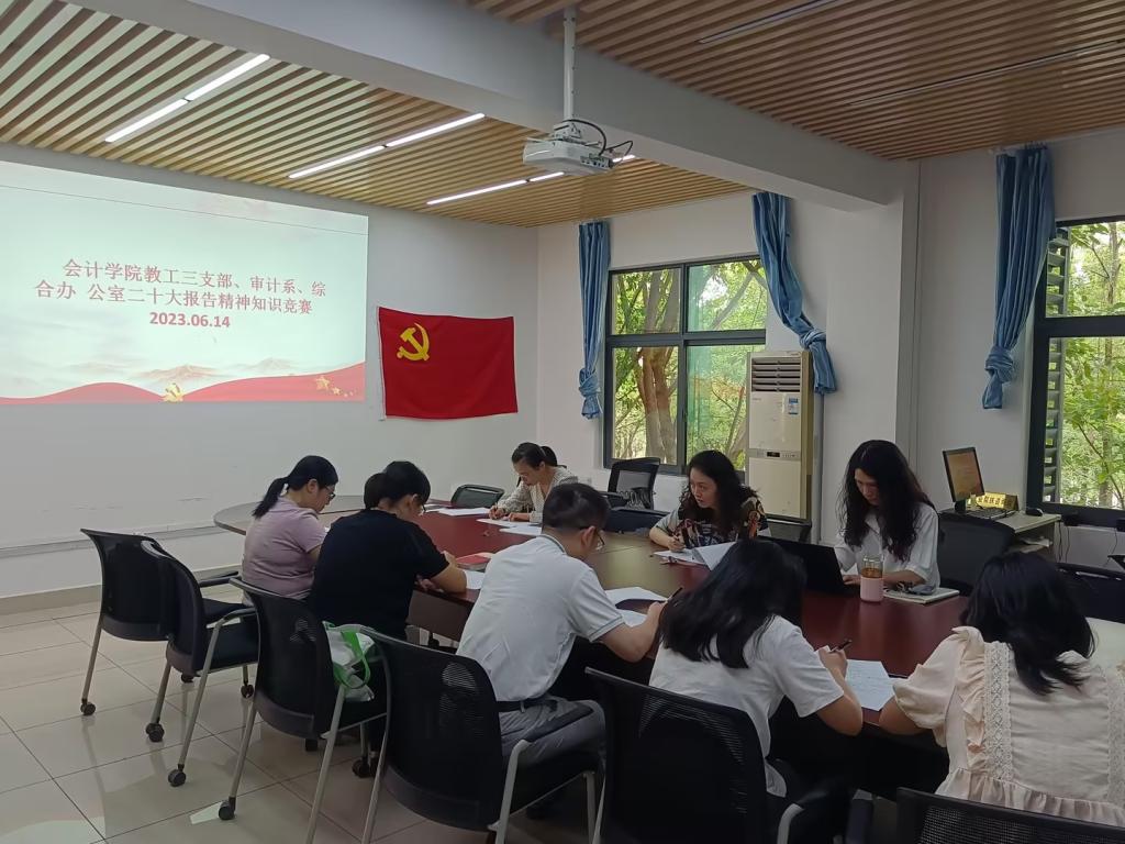 然后,教工三支部邀请了审计系和综合办公室的非党员老师一同参与“党的二十大精神”知识竞赛。本次竞赛通过书面闭卷考试的方式进行,主要围绕党的二十大报告、新党章、习近平新时代中国特色社会主义思想等内容,设置了单选题、多选题、判断题和简答题。经过激烈比拼,本次竞赛共评出一等奖5名、二等奖5名、三等奖10名。