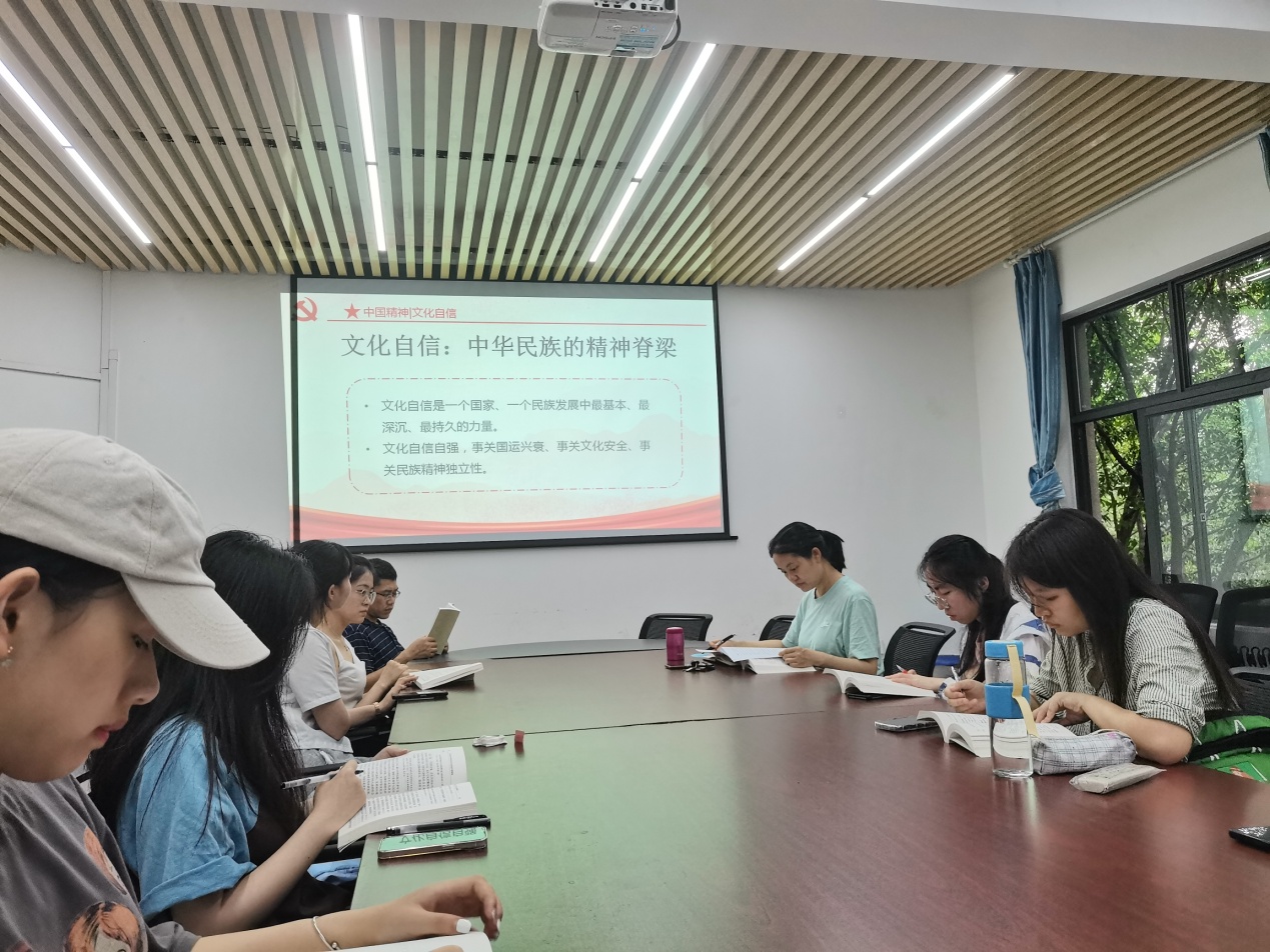 伊始,张旭同志带领大家学习《习近平新时代中国特色社会主义思想专题摘编》中的“四个自信”,重点讲解了文化自信。文化自信是中华民族的精神脊梁,是中国特色社会主义繁荣发展的精神武器。通过三星堆遗址和张家界刺绣,我们体会到了中国深厚的文化底蕴,以及传承和弘扬中国优秀传统文化的重要意义。关于文化这个问题,支部委员敬德同志谈到了文化对人和社会的深刻影响,鼓励同学们多阅览书籍,扩大知识面,多接受文化熏陶,丰富思维方式,培养主见,增强文化底蕴。