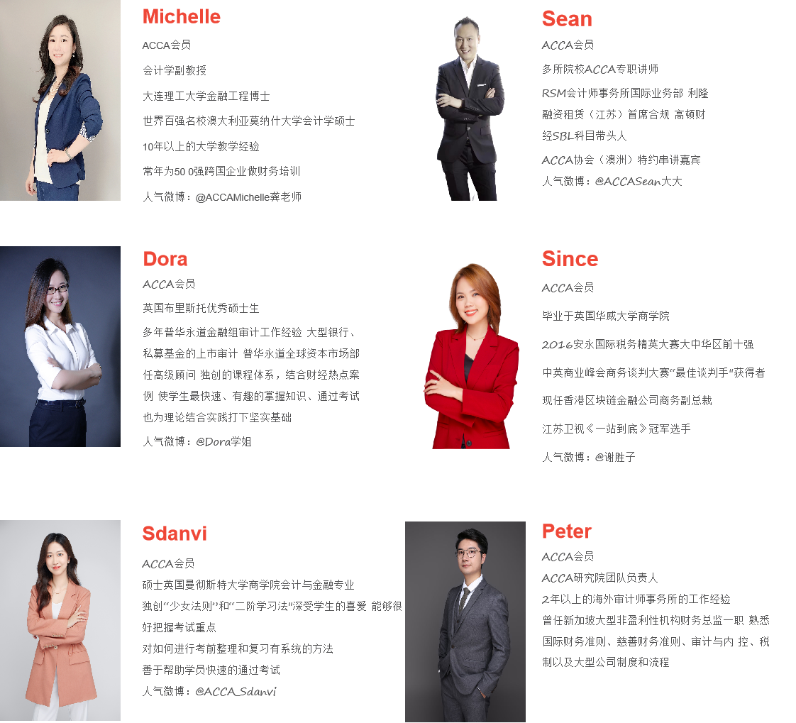 学院为ACCA业余制班配置优势师资团队,邀请国内外高水平ACCA专业讲师、知名学者教授团队来校执教。讲师团队兼具财经理论深度和财经实践广度,重视授课效果及通过水平,所有授课讲师均持有ACCA资质,知名度较高、授课经验丰富。